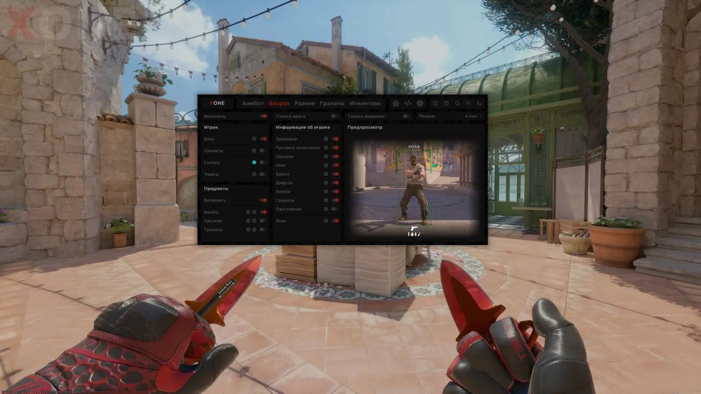 В XONE Internal присутствует весь необходимый функционал: Скинченжер (Skinchanger позволяет менять скрины в игре, наклеивать на них стикеры, вешать брелки), чамсы (Chams - заливка модели), плавный и мощный aim (аим - эта функция позволяет контролировать отдачу и доводить прицел до противников), который трудно спалить на демке, WH (вх в xone позволяет видеть противников через всю карту, это помогает выбрать изначально тактику игры), банихоп (позволяет делать распрыжку в соревновательном режиме).